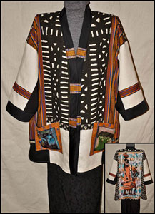 Style with a love of world fabrics: African Mud cloth & Vintage Batiks, French Linen, Hawaiian Kente & India Cotton, with 2 exterior pockets w/beadwork. 34″ Long / 24″ Wide.
