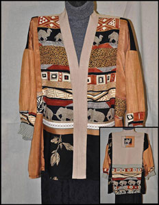 My jacket designs are meant to be loosely feminine fitted with a three quarter to wrist sleeve (not fitted). This flexible design can fit a size 10 up to a 16. For smaller or larger Special Orders are welcome.