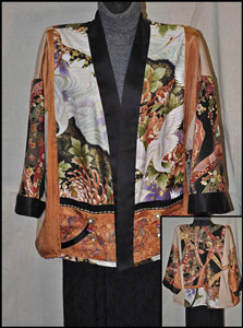 My jacket designs are meant to be loosely feminine fitted with a three quarter to wrist sleeve (not fitted). This flexible design can fit a size 10 up to a 16. For smaller or larger Special Orders are welcome.